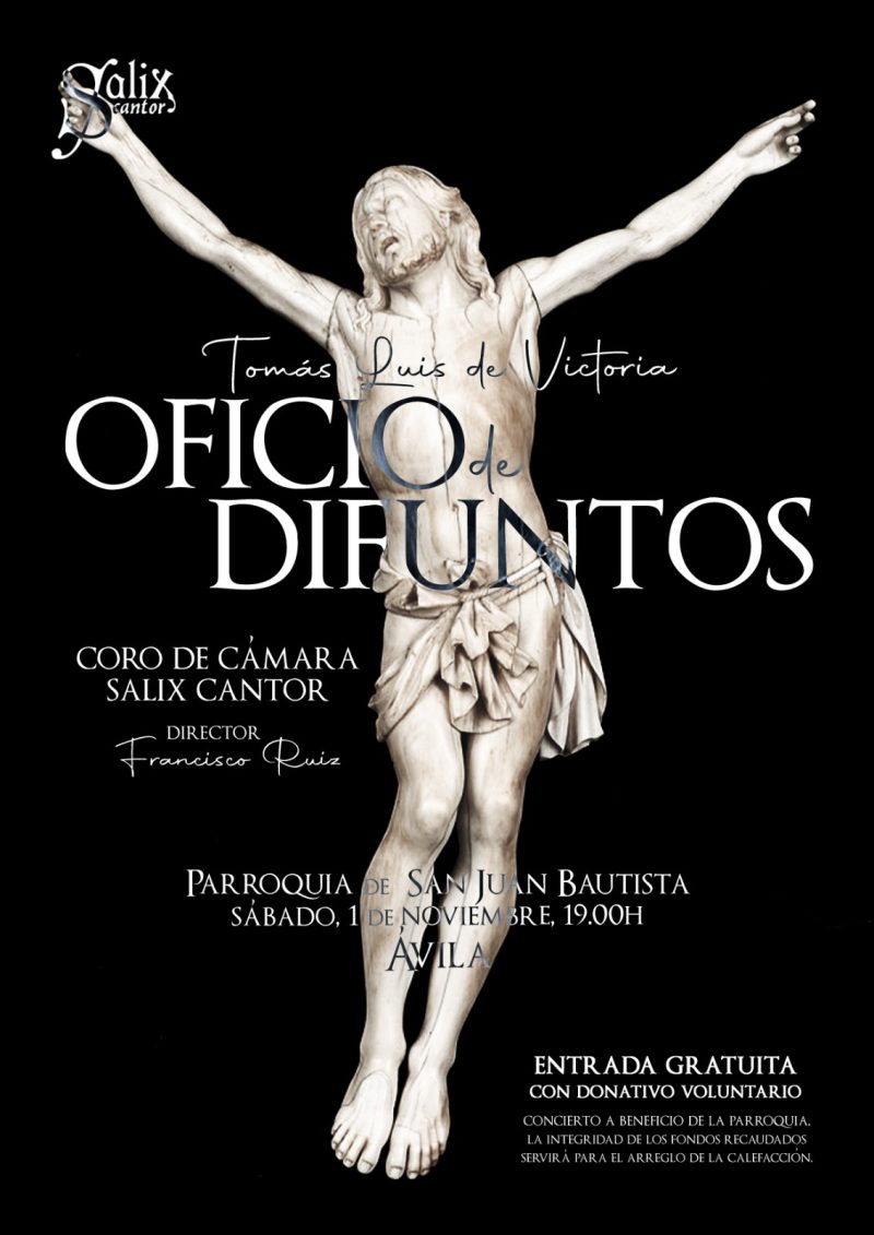 El coro de cámara Salix Cantor, de Madrid, ofrece tradicionalmente este oficio de difuntos en el mes de noviembre y elige para ello lugares emblemáticos de la geografía española. Si en 2024 el lugar elegido fue la Catedral de Granada, dentro de la conmemoración de su 500 aniversario, este año es la iglesia de San juan Bautista, en Ávila, por ser la parroquia y el lugar de bautismo de Tomás Luis de Victoria, compositor abulense y universal.